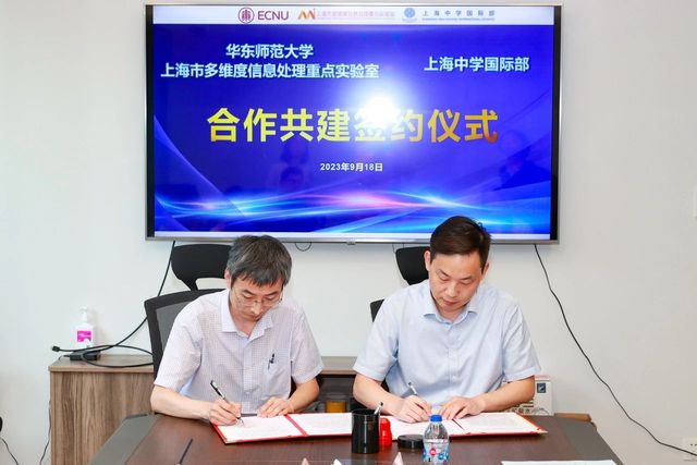 9月18日下午,华师大上海市多维度信息处理重点实验室主任李庆利教授和上海中学国际部初小段校长刘炼老师分别代表双方签署共建合作协议。华东师范大学通信与电子工程学院通信工程系支部书记周梅老师、科创指导田应洪老师、辅导员王海建老师、陈建刚老师,与上海中学国际部初小科技总指导姚昇华老师等共同参与了此次签约仪式。