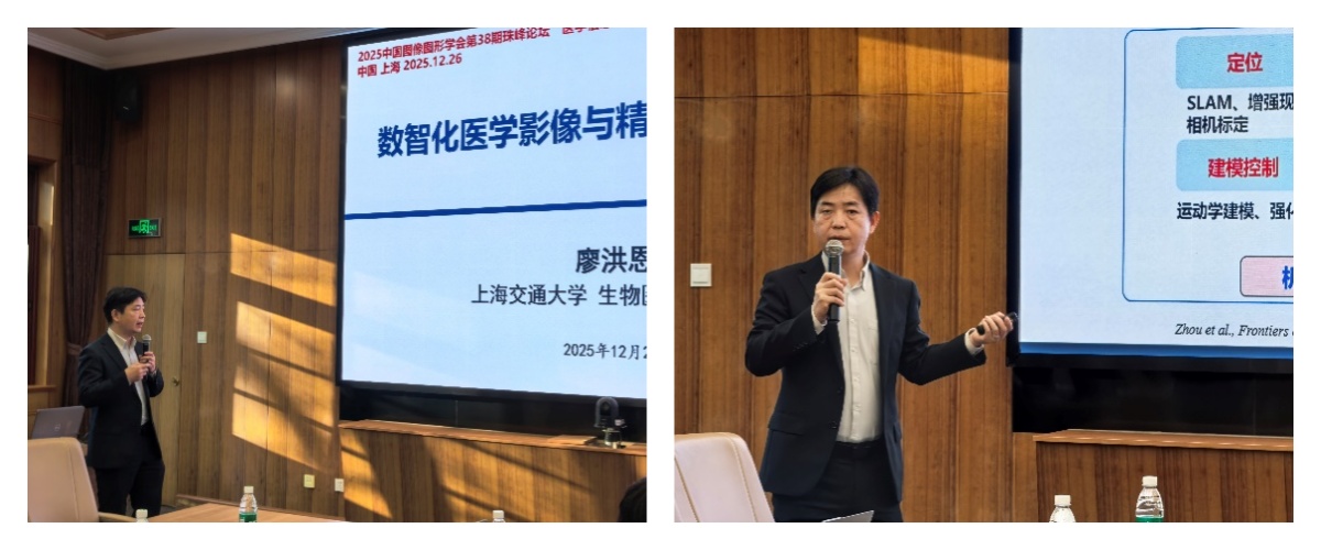 上海交通大学廖洪恩教授分享了《数智化医学影像与精准诊疗自主决策》的研究。他重点介绍了支气管手术自主操控技术的研发,其核心在于融合人机交互、影像导航与智能控制,以提升操作精度与自动化水平。相关主从控制与微创治疗方案已进入临床试验。未来工作将聚焦于治疗与影像的深度智能融合,推动实现“智能伙伴式”精准诊疗。